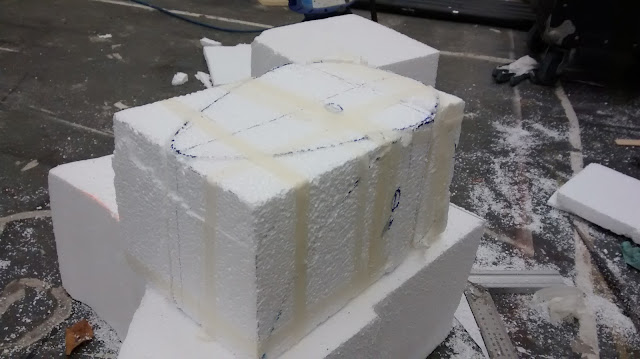 I first started with the body. I'd seen Ted Haines use this carving technique in one of the Stan Winston School videos, It's a great way to take away a lot of material and produce the initial shape quickly. I drew the shape of the body from the top and sides onto a polystyrene block.